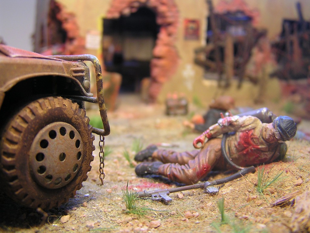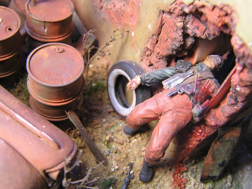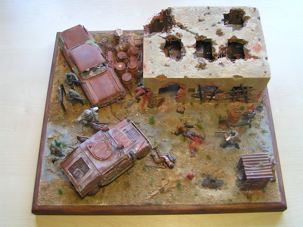 | Stručný popis stavebnice: | Stavebnice M-1025 Armored Carrier od firmy Acadamy je kvalitní a za nízkou cenu. Je docela pěkně zpracována. Figurky jsou všechny od Zvezdy. Použil jsem Vympel Russian Anti-Terrorist Unit jako jednotky BOS. Na bandity posloužila stavebnice Soviet Mountain Infantry. Budova je postavena od nuly, stěny jsou odlité ze sádry. |
