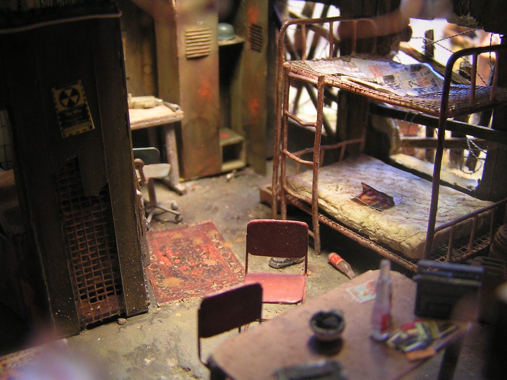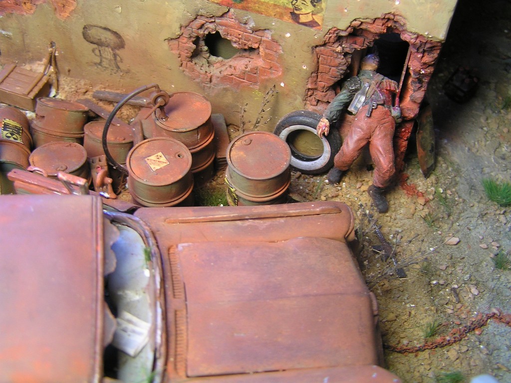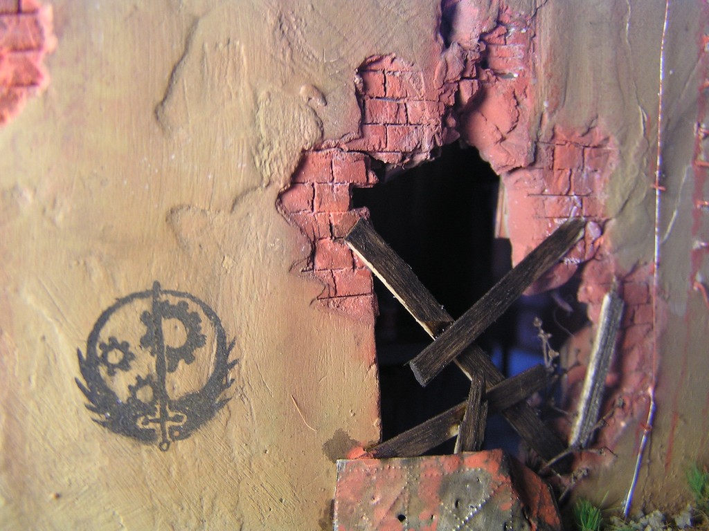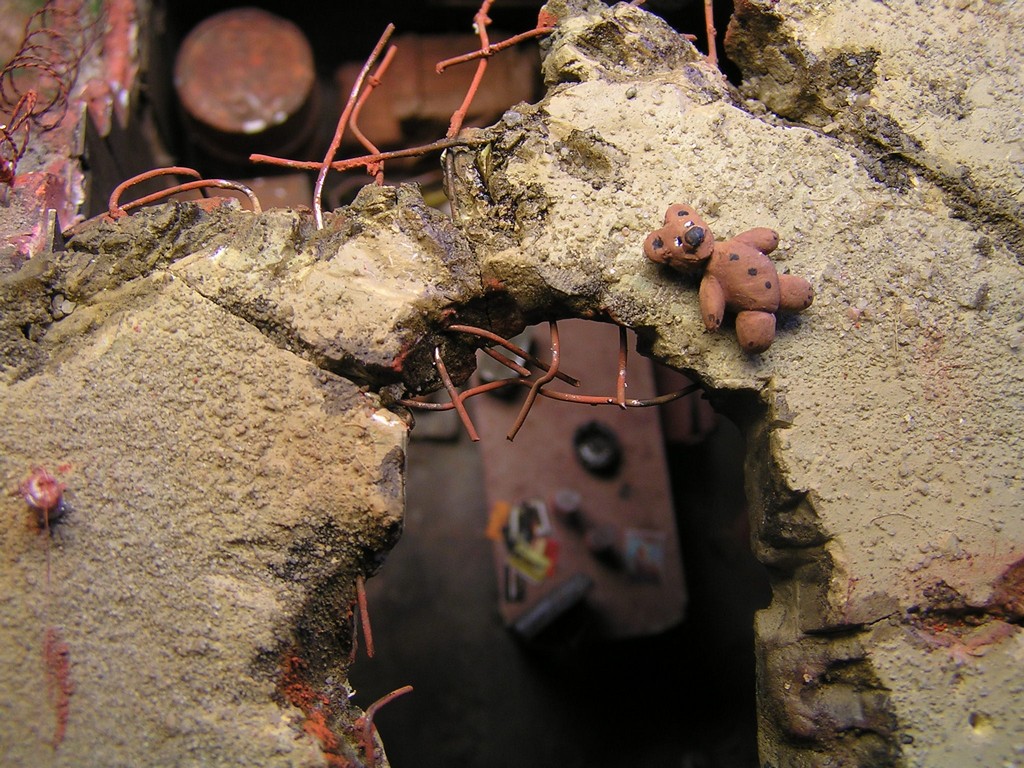 | Stručný popis stavby: | Stavbu dioramy jsem začal vymodelováním paladina Bratrstva oceli. Kvalitní hmota pro tvorbu je Miliput. Vždy jsem dělal figurky jen ze stavebnice, modelování paladina byla moje premiéra. Miliput jsem použil také na tvorbu spousty detailů v interiéru budovy. Hlínu jsem vytvořil ze směsi dřevěných pilin, sádry, lepidla a statické trávy. |