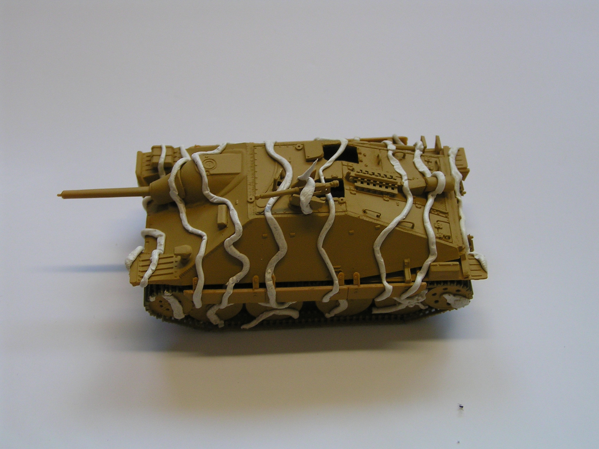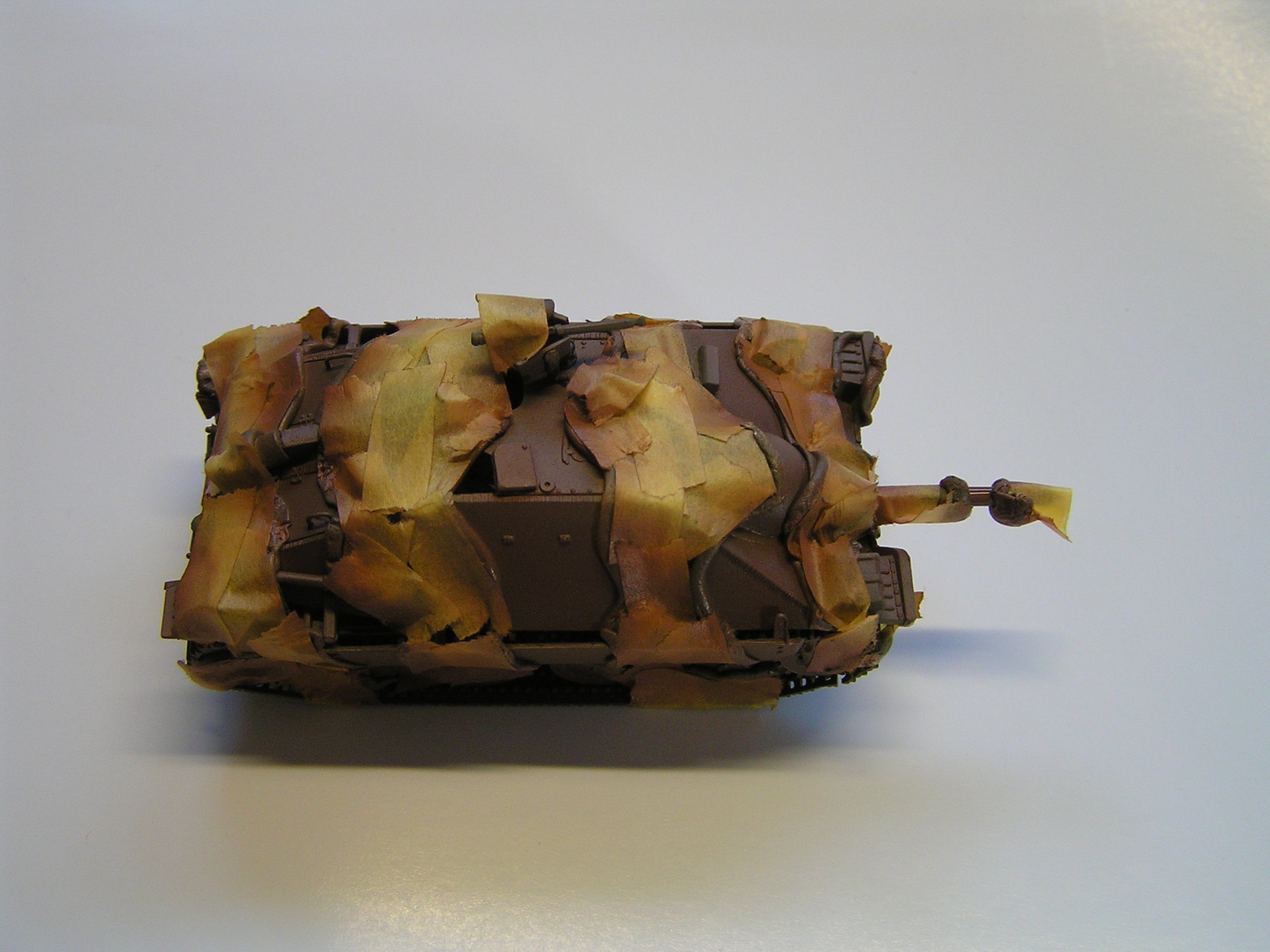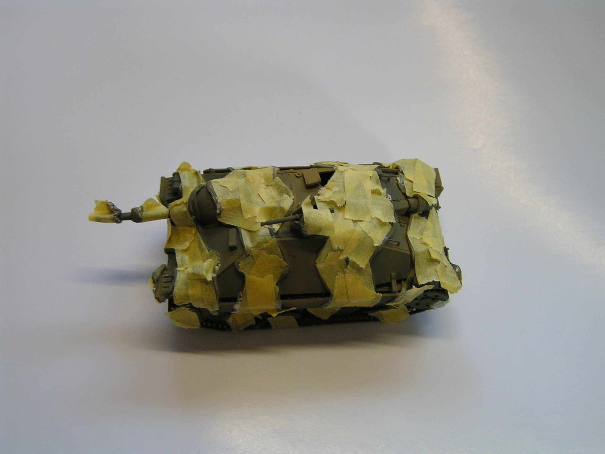 | Stručný popis stavby: | Na stavbu jsem použil akrylové barvy Vallejo a Tamyia. Díly pěkně lícují, takže nemusíme použit moc tmelu. Zbarvení modelu je poměrně jednoduché. Použil jsem krycí pásku a lepící gumu, kterou rozválím na tenké nudle a přilepím na model. Ukázka jde vidět na přiložených fotkách. Model je velmi malý a nemám tak tenkou trysku, abych airbrushem dosáhl kýženého efektu bez použití gumy a krycí pásky. |