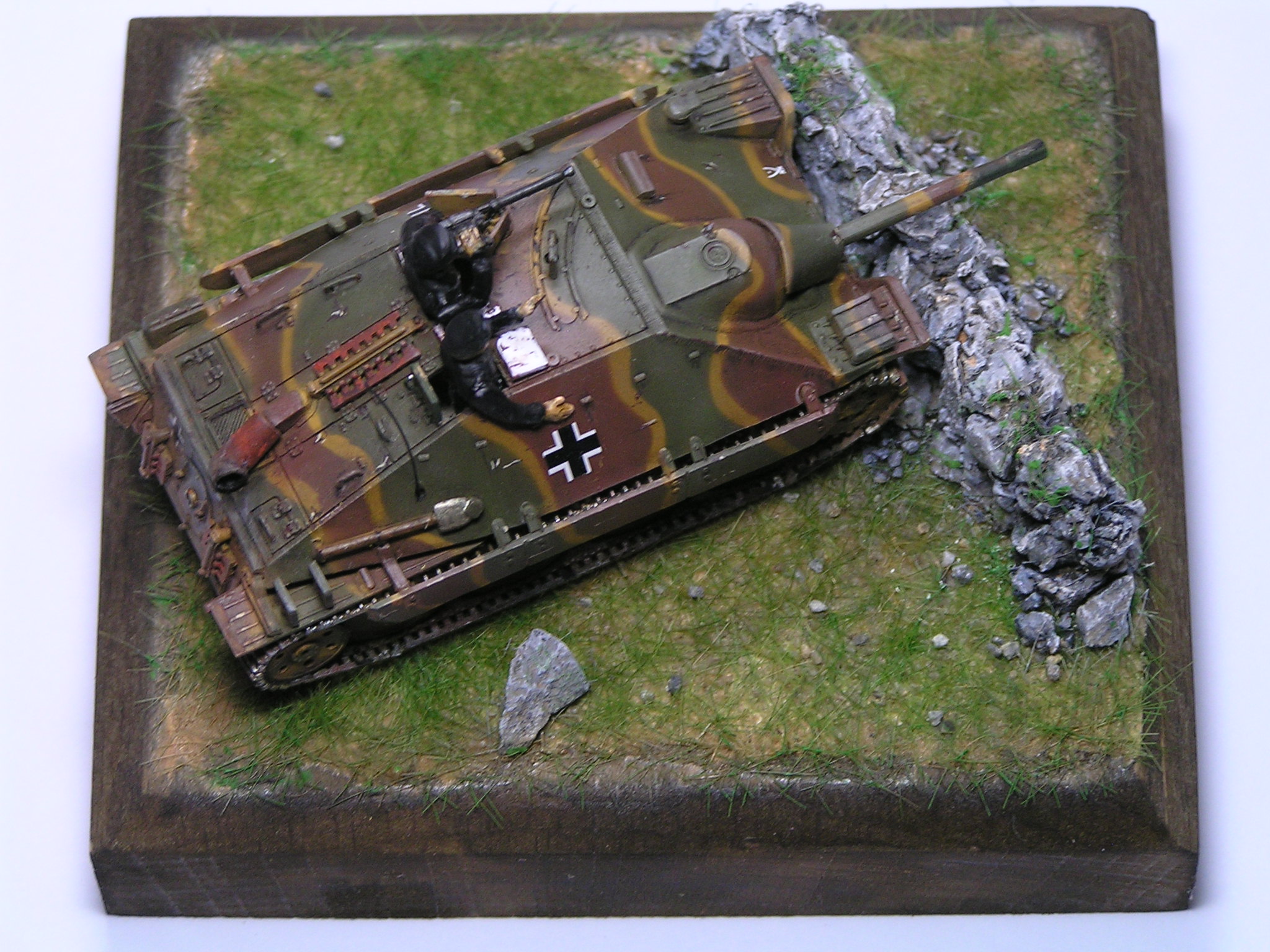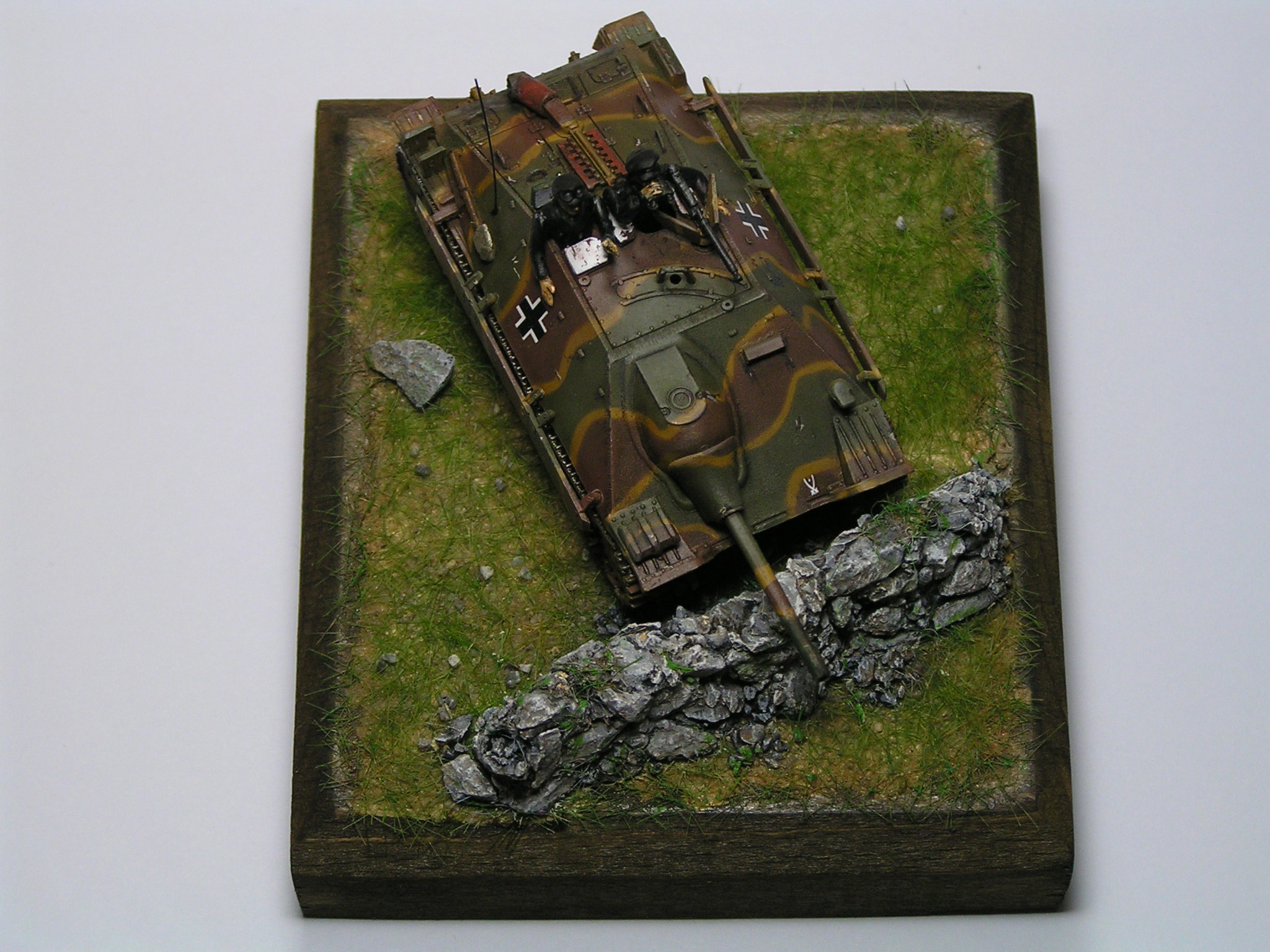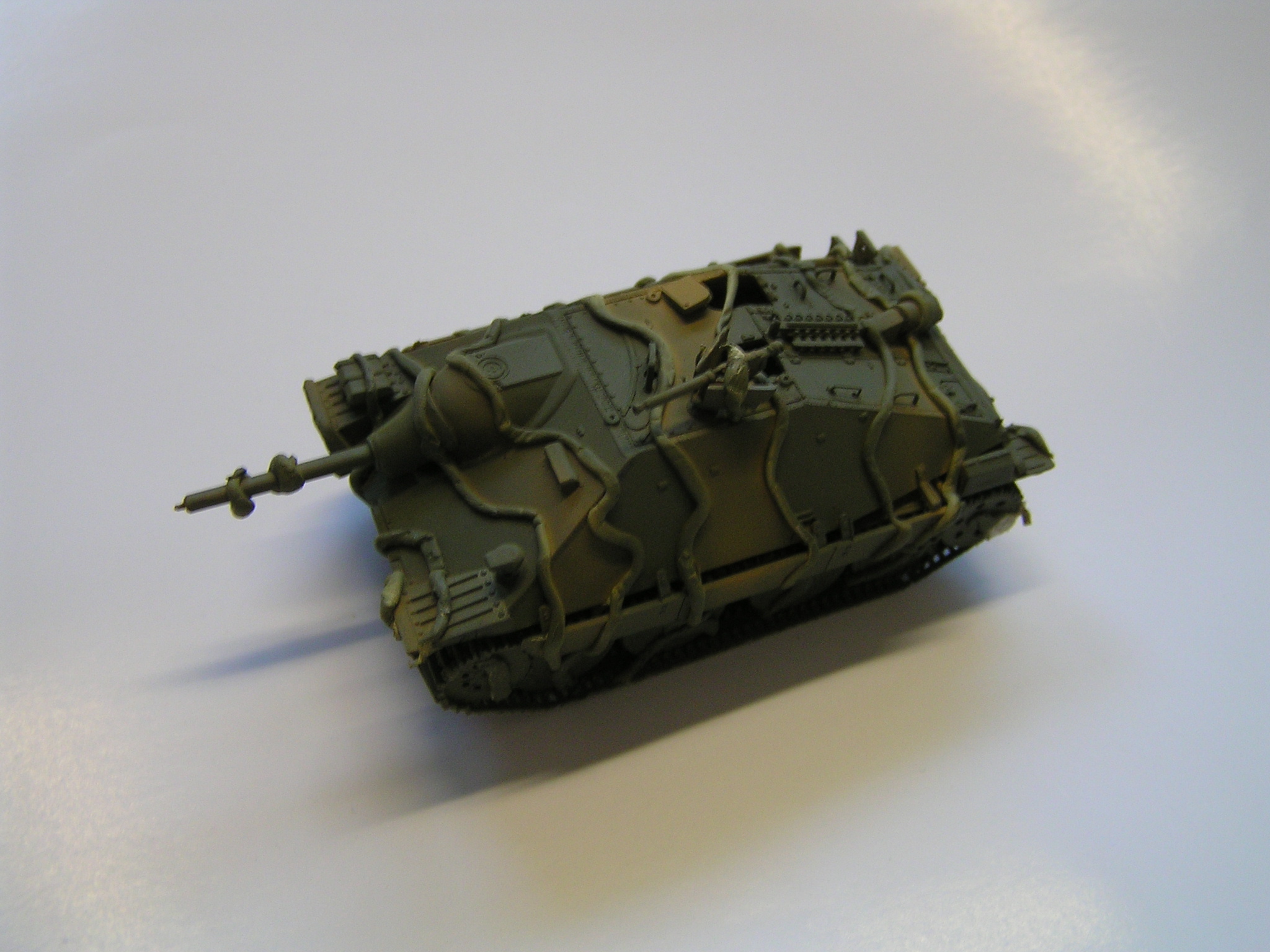 | Stručný popis stavby: | Na stavbu jsem použil akrylové barvy Vallejo a Tamyia. Díly pěkně lícují, takže nemusíme použit moc tmelu. Zbarvení modelu je poměrně jednoduché. Použil jsem krycí pásku a lepící gumu, kterou rozválím na tenké nudle a přilepím na model. Ukázka jde vidět na přiložených fotkách. Model je velmi malý a nemám tak tenkou trysku, abych airbrushem dosáhl kýženého efektu bez použití gumy a krycí pásky. |