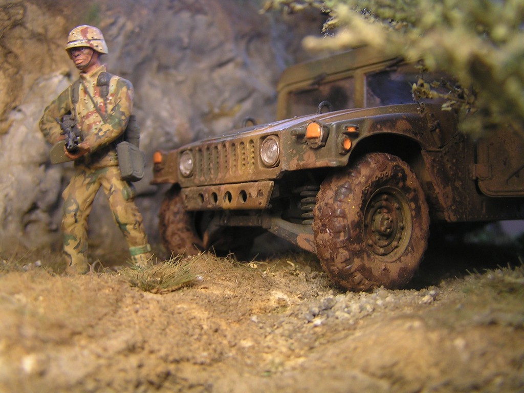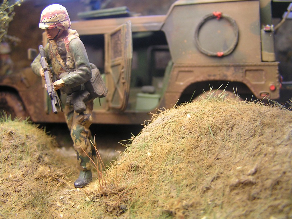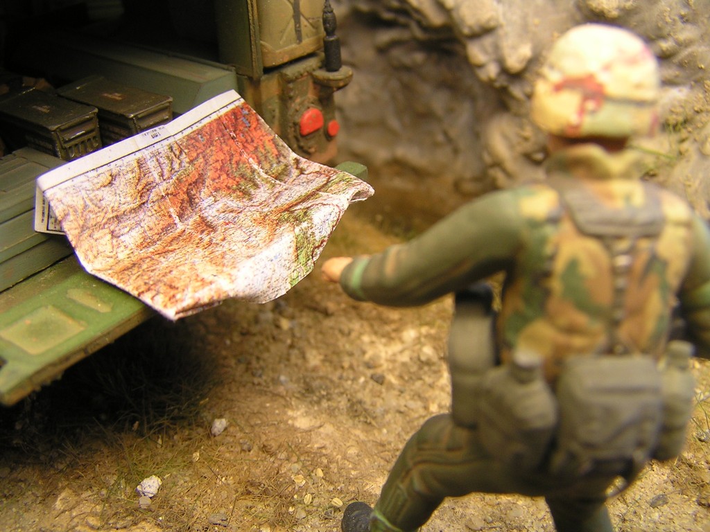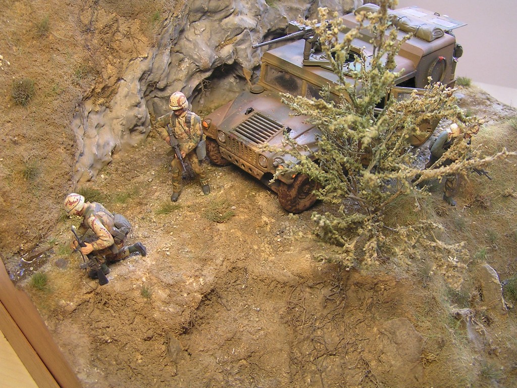Diorama je zasazeno do horského průsmyku v Afghánistánu během amerických operací. Hlídka čtyř příšlušníků americké armády se vrací se svým vozidlem (Humvee verze M998) zpátky na základnu. Po prudkých deštích ale kus cesty ujel ze svahu a hlídka se zastavila, aby vojáci prozkoumali a zhodnotili terén. Cesta se zdá být neprůjezdná, a proto hledají novou trasu v rozložené mapě. Jeden z vojáků svým nožem vyhrabává ze země starou nevybuchlou minu. Může to být jen náhoda, ale vojáci jsou obezřetní a raději kontrolují, jestli nehrozí nějaké nebezpečí ze strany povstalců.