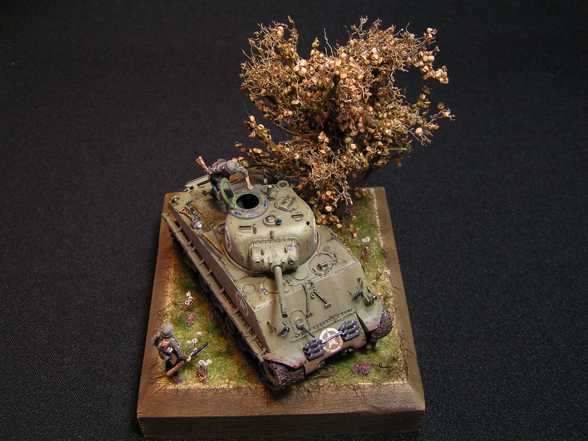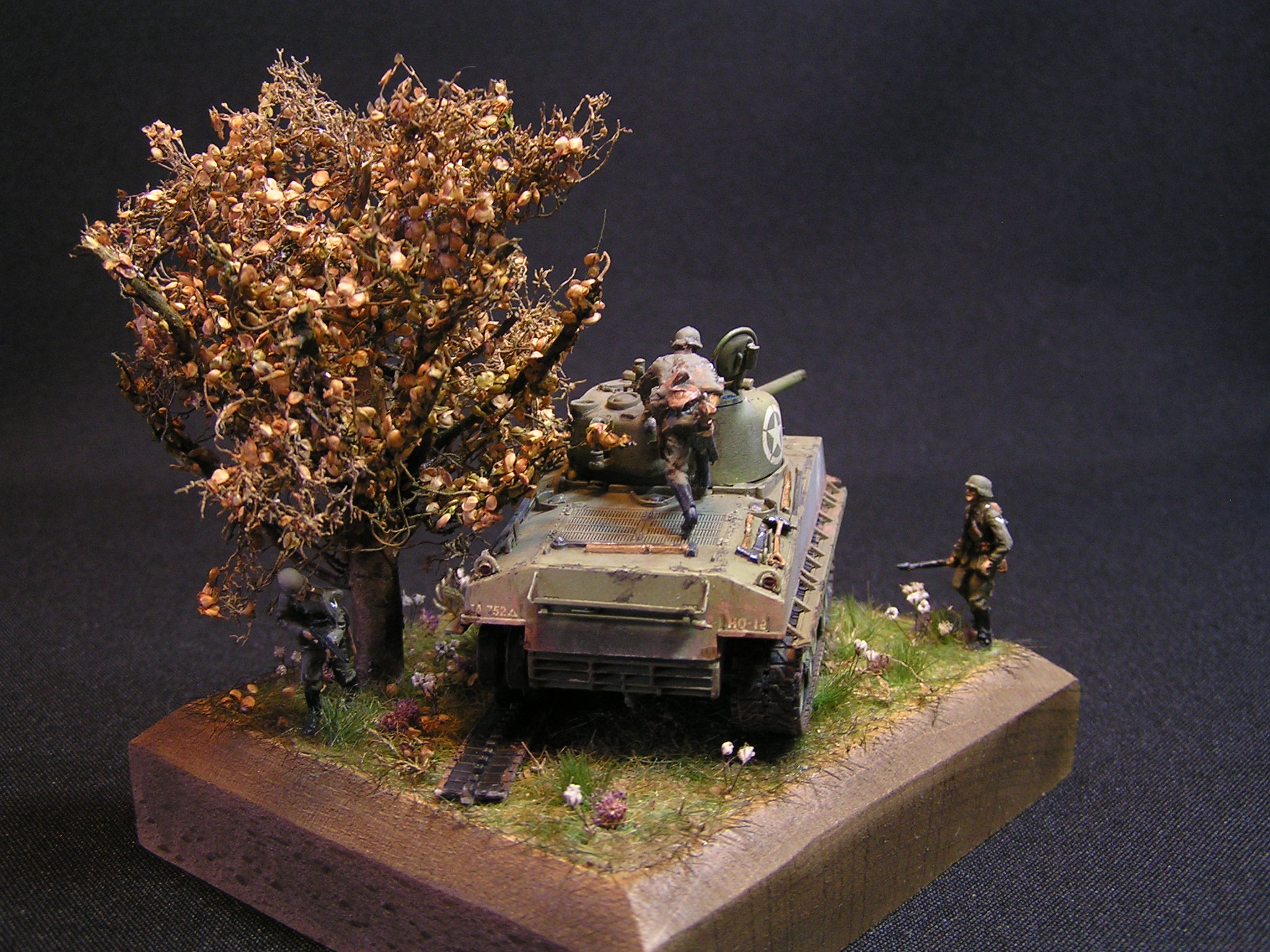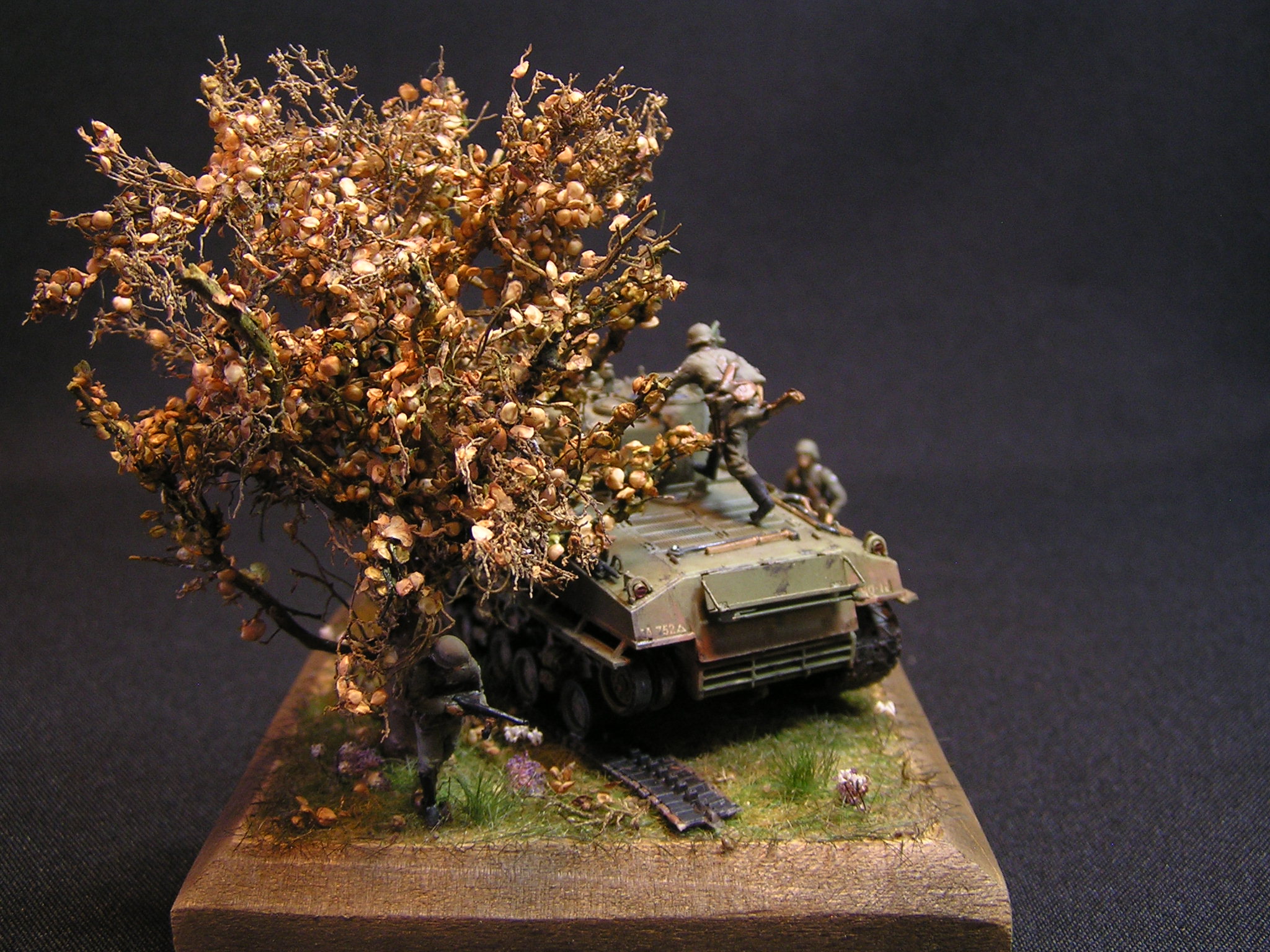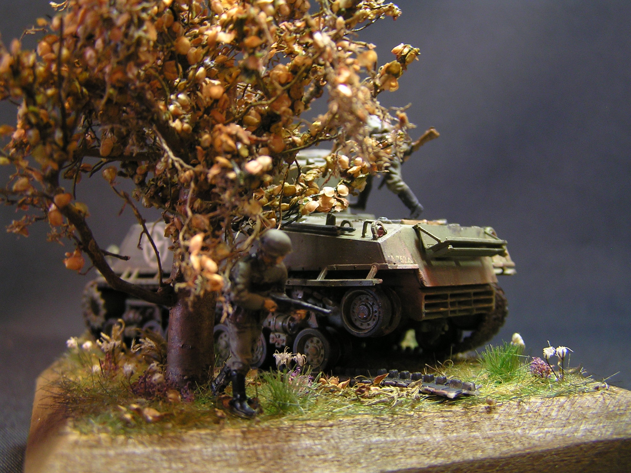 | Stručný popis stavby: | Použil jsem akrylové barvy Tamyia a Vallejo. Model jsem přelakoval lesklým akrylovým lakem Tamyia. Následně jsem zapustil hnědý wash, znázornil stíny oleji a namaloval opotřebení. Nakonec jsem model zafixoval matným lakem. Na dioramu jsem použil statickou trávu a drobné kytičky. Strom je slepený z kořínků, které jsem našel v lese a přilepil drobné lístečky z jehněd břízy. Nakonec jsem přilepil německé vojáky ze stavebnice German Armoured Infantry WW II vyráběných firmou Revell. |