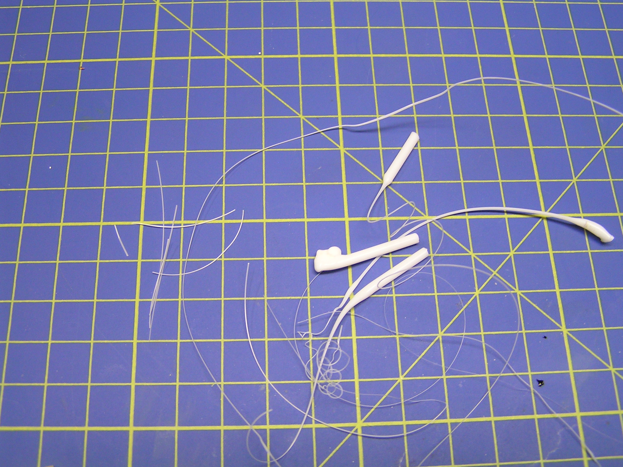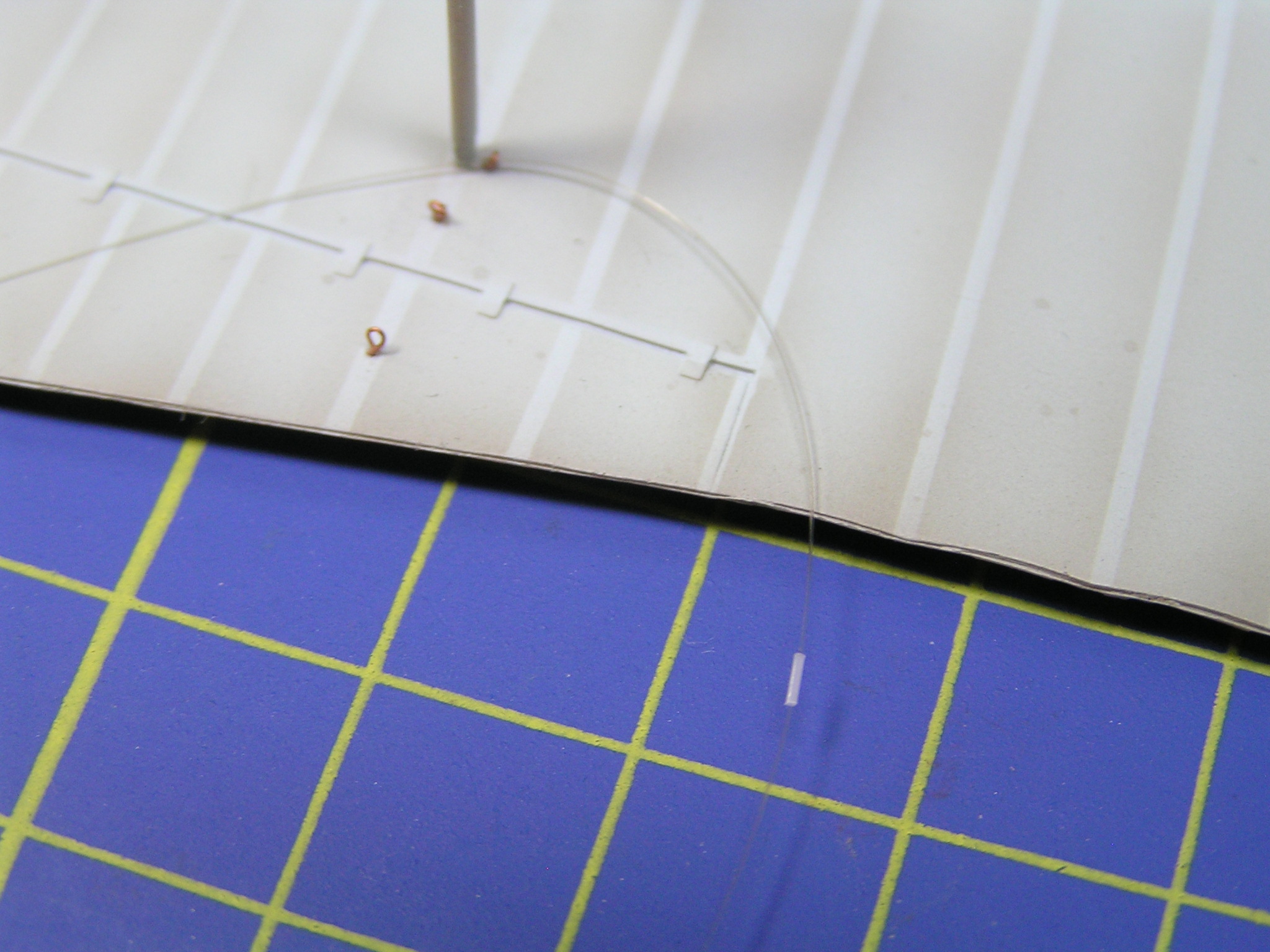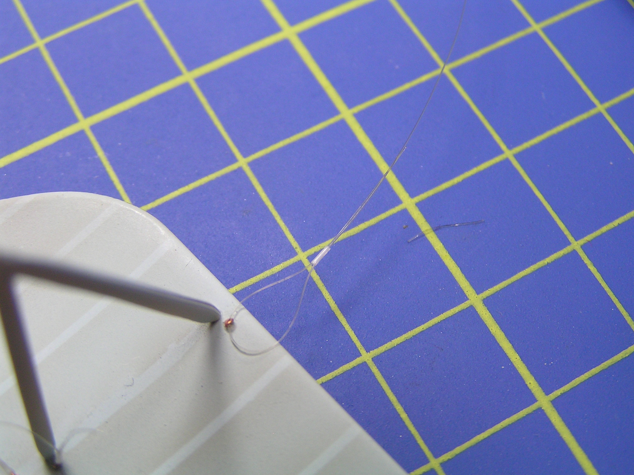 Dříve, když jsem hledal vhodné materiály, tak jsem používal vlasce z vytaženého plastového rámečku, ale ten byl velmi křehký a snadno se přetrhl. Po zjištění, že rybáři používají silonové vlasce o průměru 0,12 mm, jsem hned utíkal do místních rybářských potřeb. Koupil jsem několik špulek silonového vlasce o návinu 100 m. Cena jedné krabičky se pohybuje kolem 30 korun a vystačí vám na hodně modelů. Zkoušel jsem i pletený černý vlasec 0,04 mm, ale ten se třepí.