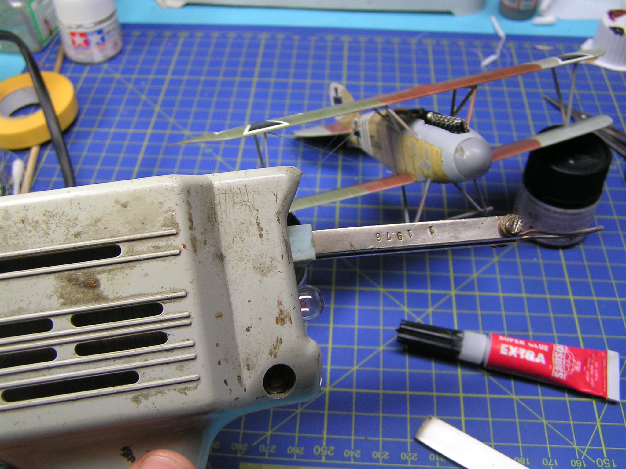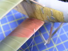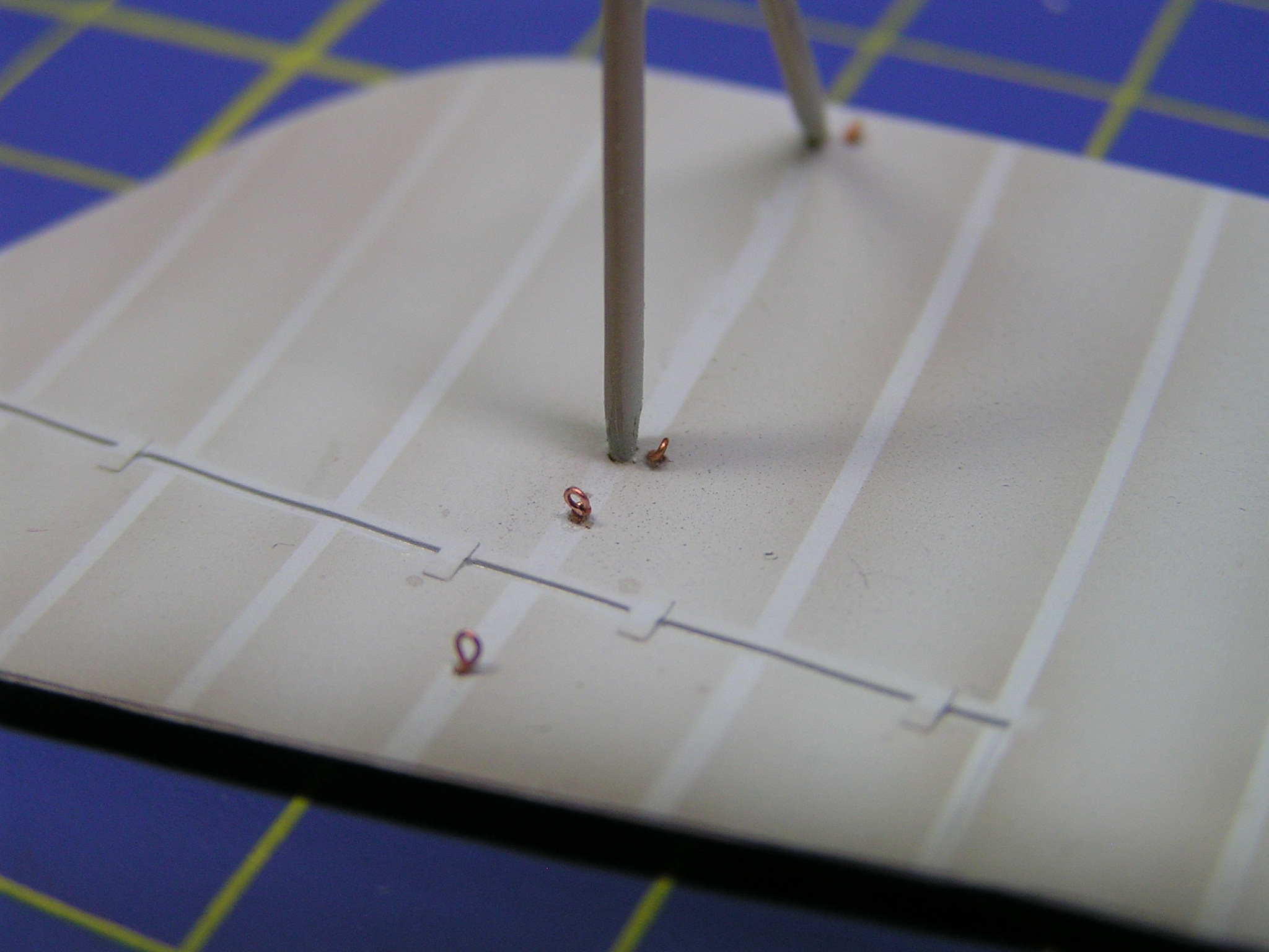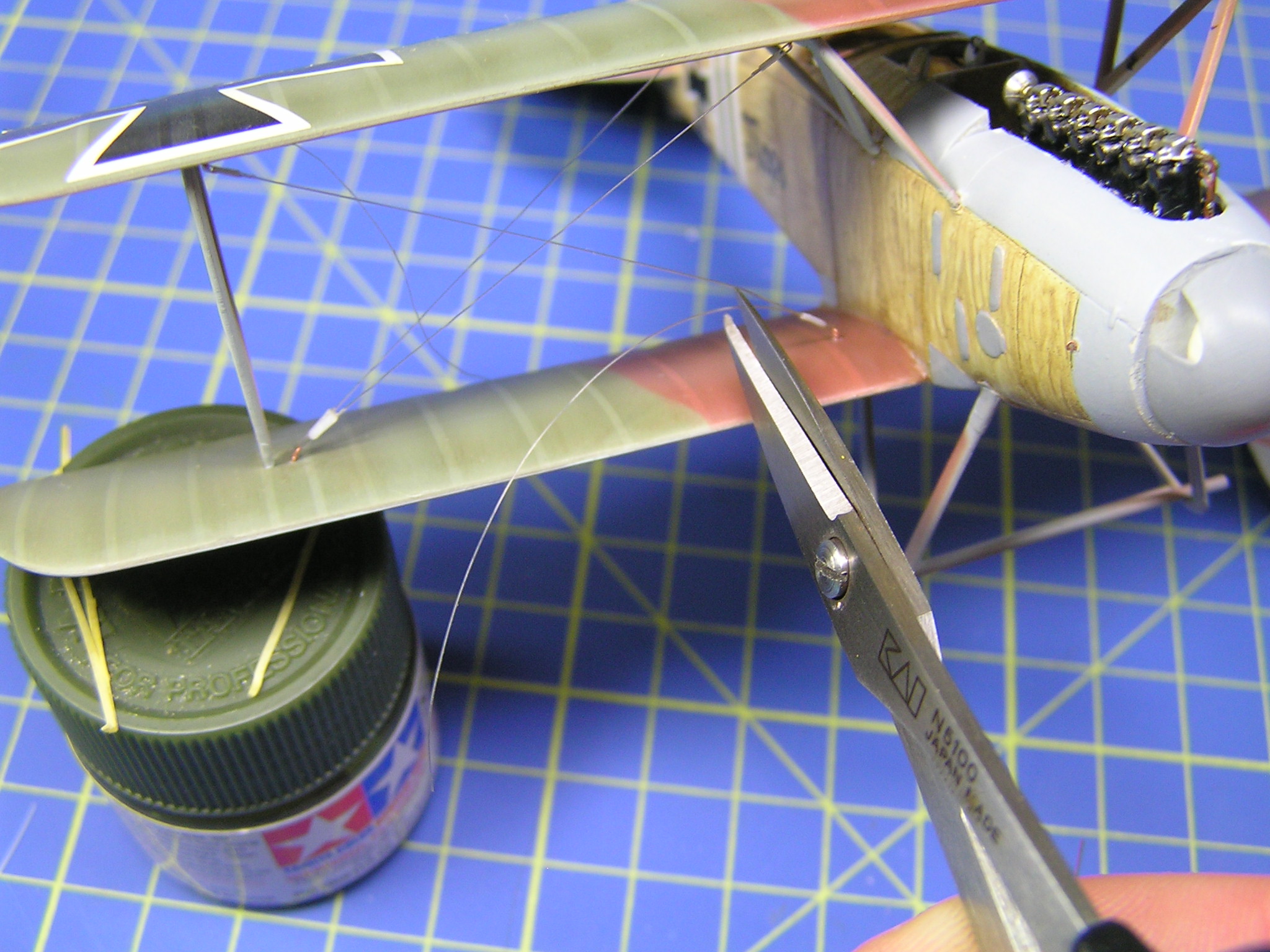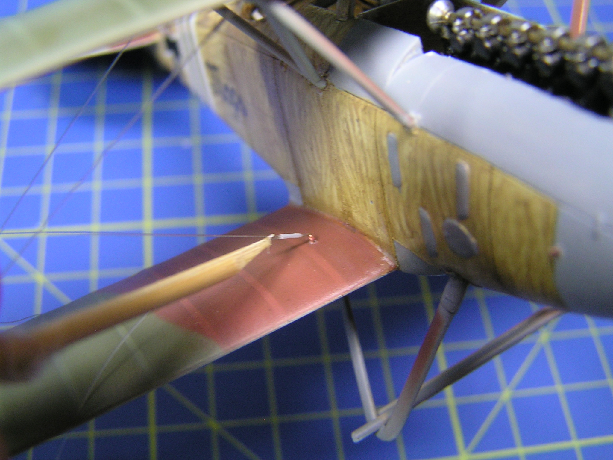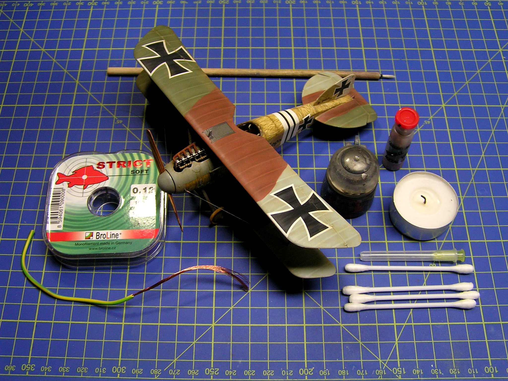 Na model Albatrosu jsem nakonec zvolil průměr 0,12 mm pro snadnější provlékání dutinek. Výplety mezi křídly opravdových letounů měly takzvané napínáky, které si vyrobíme z uchošťourů (rozuměj, vatových tyčinek :-). Dobré je odstřihnout část s vatou, omezíme tak případné vzplanutí. Tyčinku nahřejeme nad svíčkou nebo plynovým hořákem a jemně natáhneme. Chce to trochu cviku, a proto vám dám nějaké postřehy z tavení: