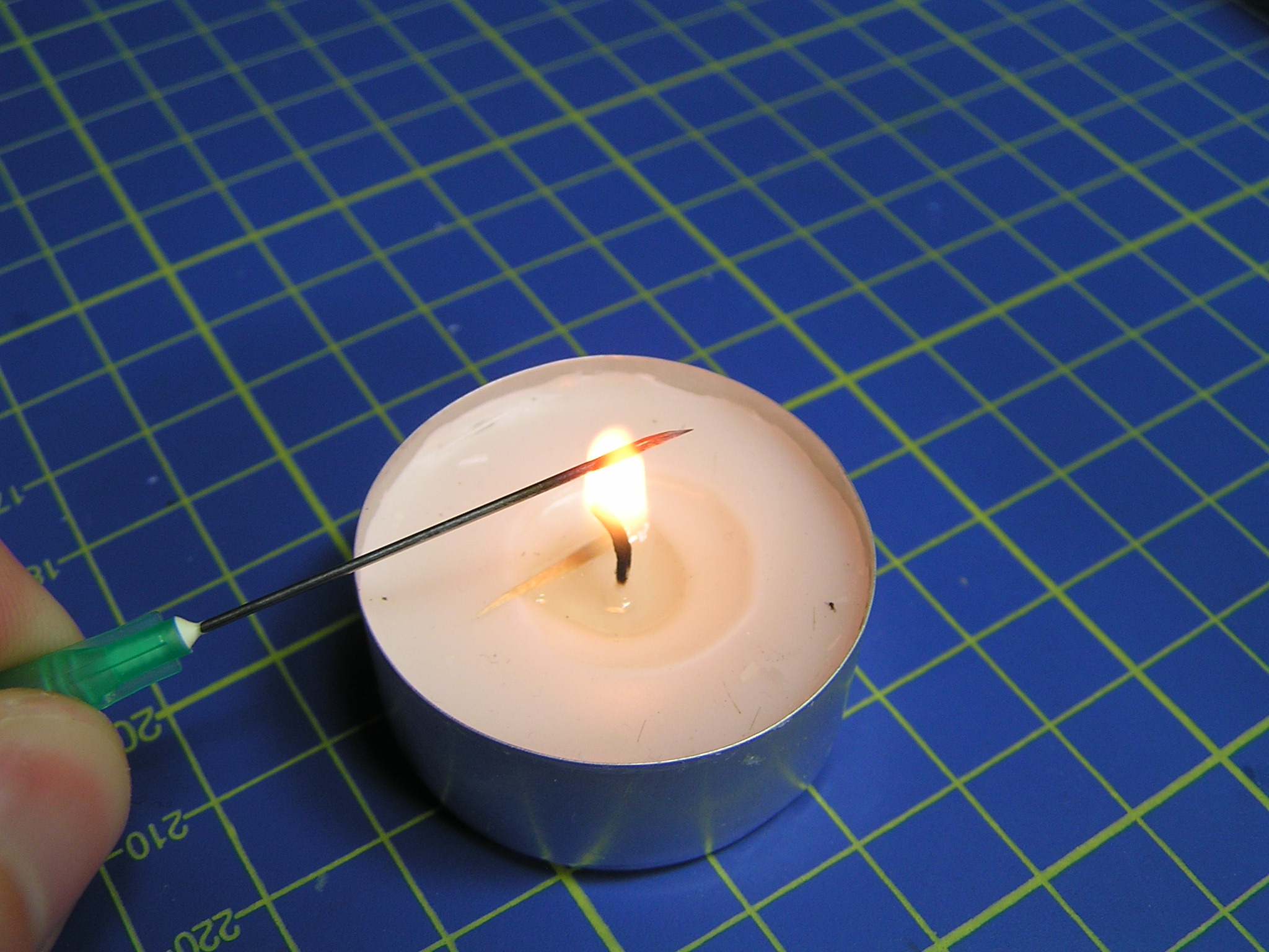 - Budeme potřebovat svíčku a jehlu. Preferuji injekční jehlu kvůli jejímu plastovému konci, který nám zaručí bezproblémové uchycení do prstů bez toho, aniž bychom se popálili. Jehlu nahřejeme nad plamenem až do zčervenání kovu. Následně jehlu přiložíme k výpletu a vlasec se během okamžiku napne. Zde je ovšem větší riziko přetavení silonu, protože teplota je nestálá a rychle se mění.