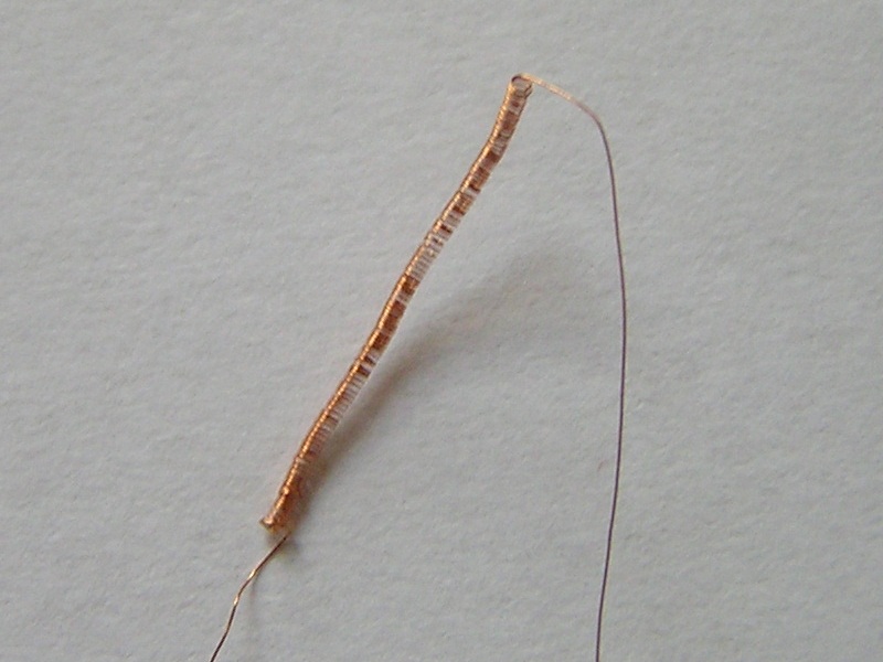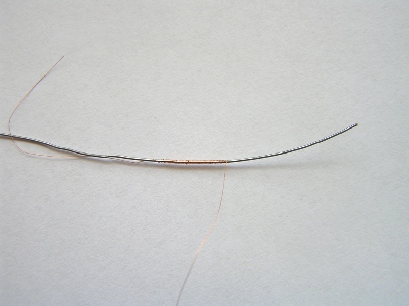 1. Obtočíme 0.05 mm drát kolem tlustšího.
