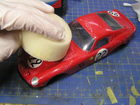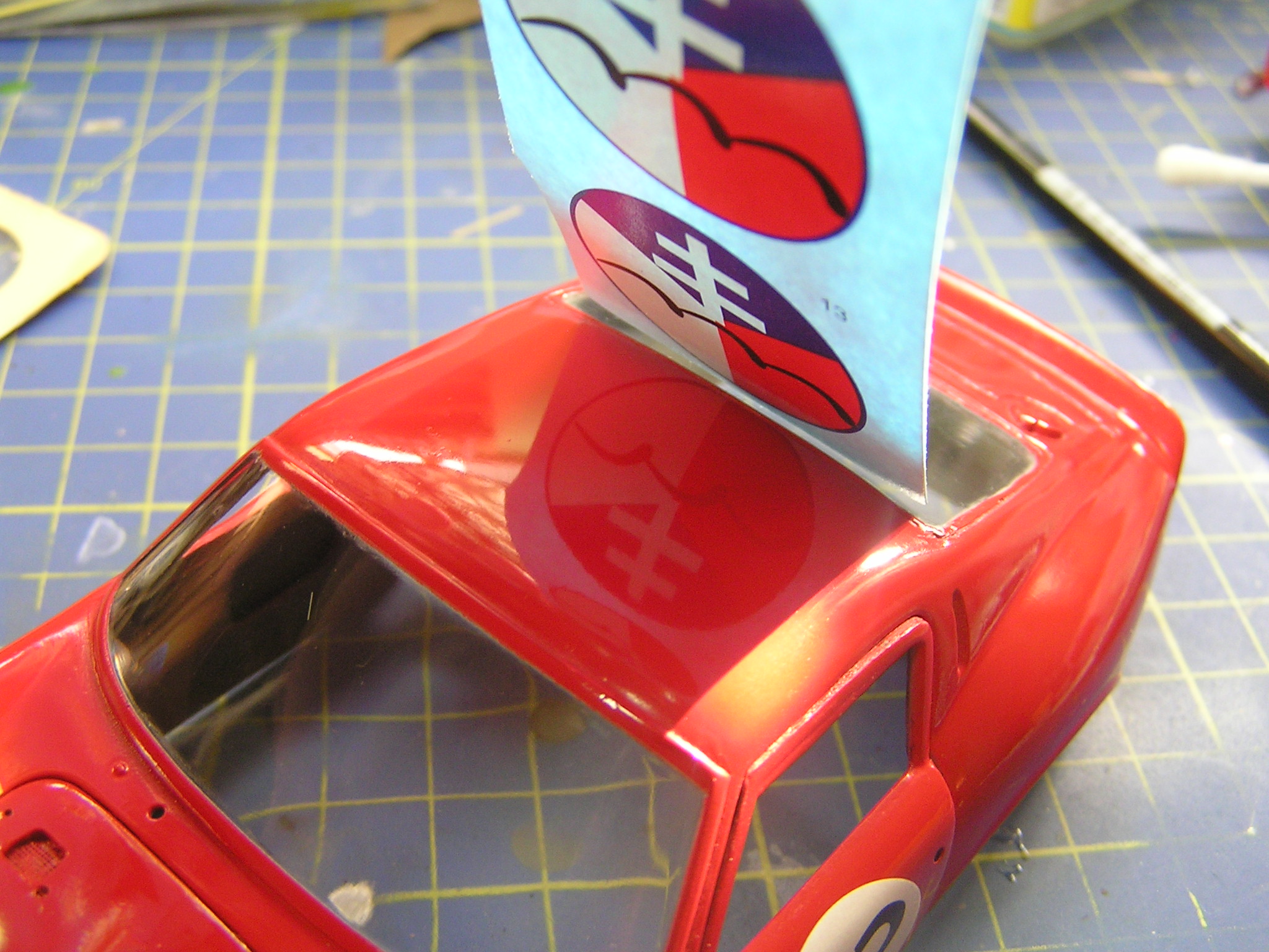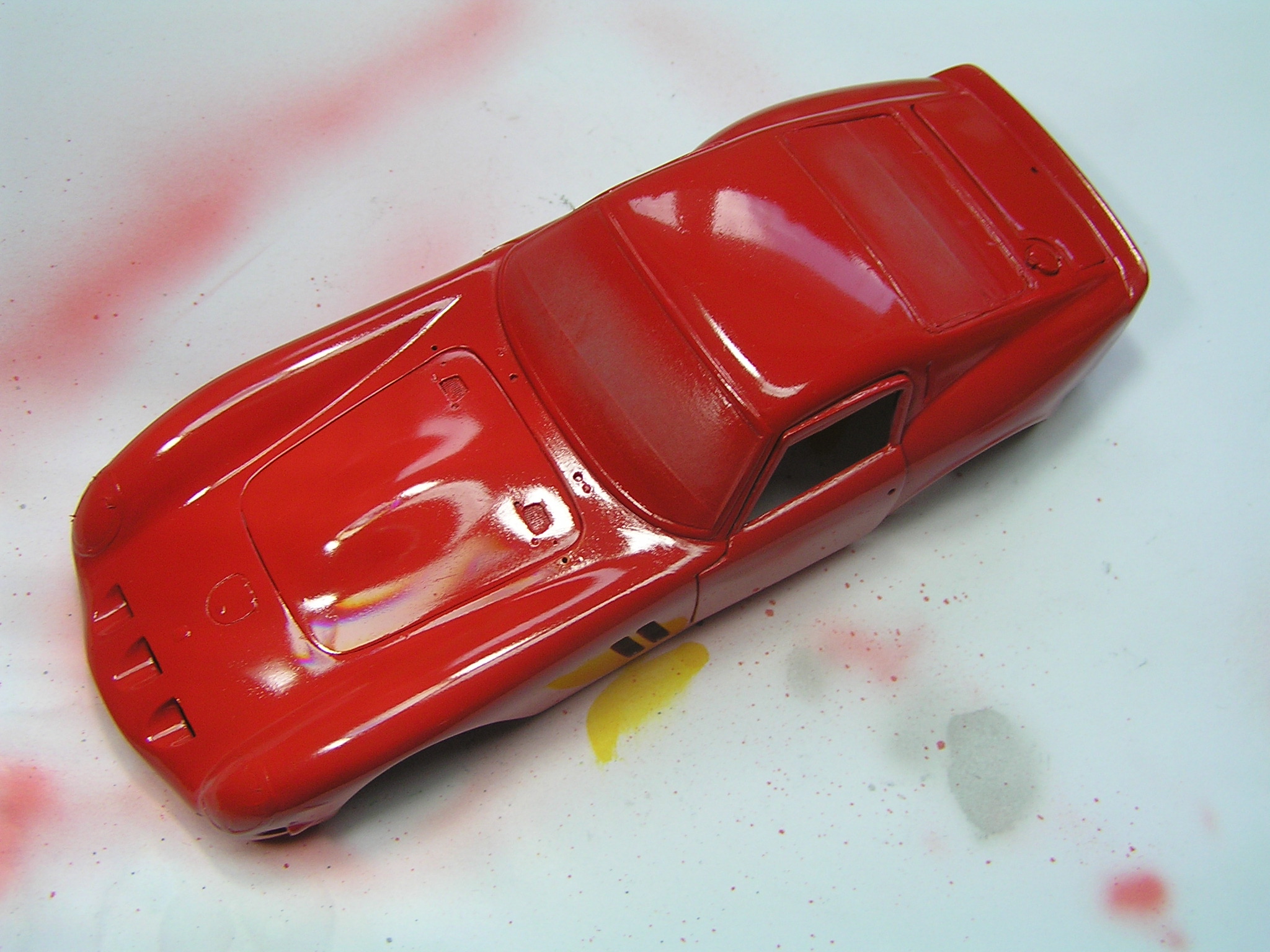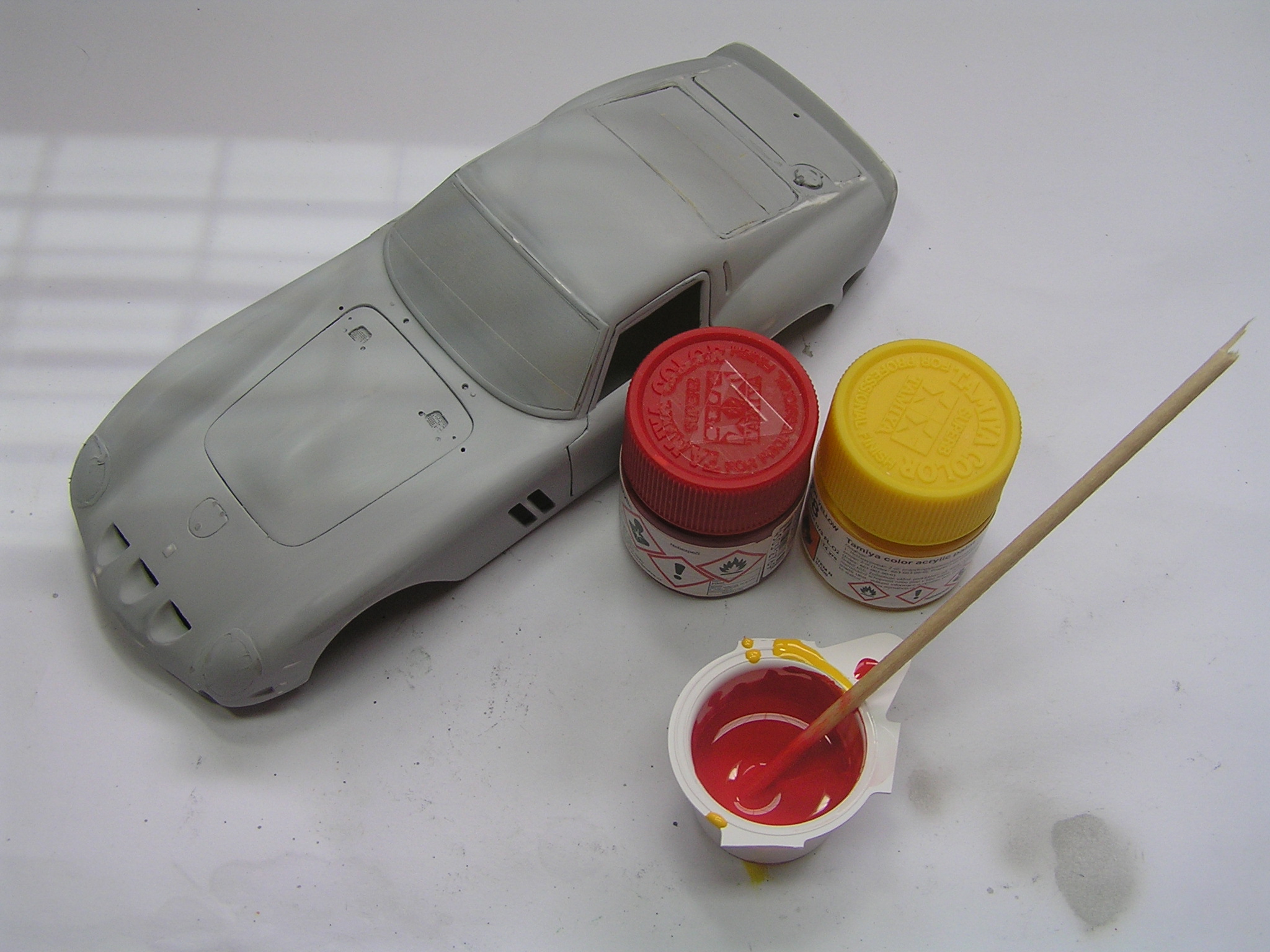Velmi důležitou fází, před samotným barvením, je perfektní začištění a zatmelení prohlubní a nálitků. Já jsem použil tmel Tamiya a surfacer ve spreji stejné značky. Po zaschnutí jsem zatmelené části přebrousil smirkovým papírem o zrnitosti 500 opět až na plast. Pak jsem model znovu přestříkal surfacrem, abych zakryl bílý plast a sjednotil povrch. Vše jsem následně zahladil a začistil smirkem o zrnitosti 1500. Takto nachystanou karoserii jsem otřel mikrotenovým hadříkem a profouknul airbrushem, abych odstranil prach z broušení. Protože nemám odstín barvy, který by odpovídal reálnému autu, namíchal jsem si vlastní odstín ze žluté barvy Tamiya X-24 a červené X-27. Poté jsem barvu naředil ředidlem X-20. Vše jsem pak v několika vrstvách nanesl na model a nechal pořádně zaschnout.