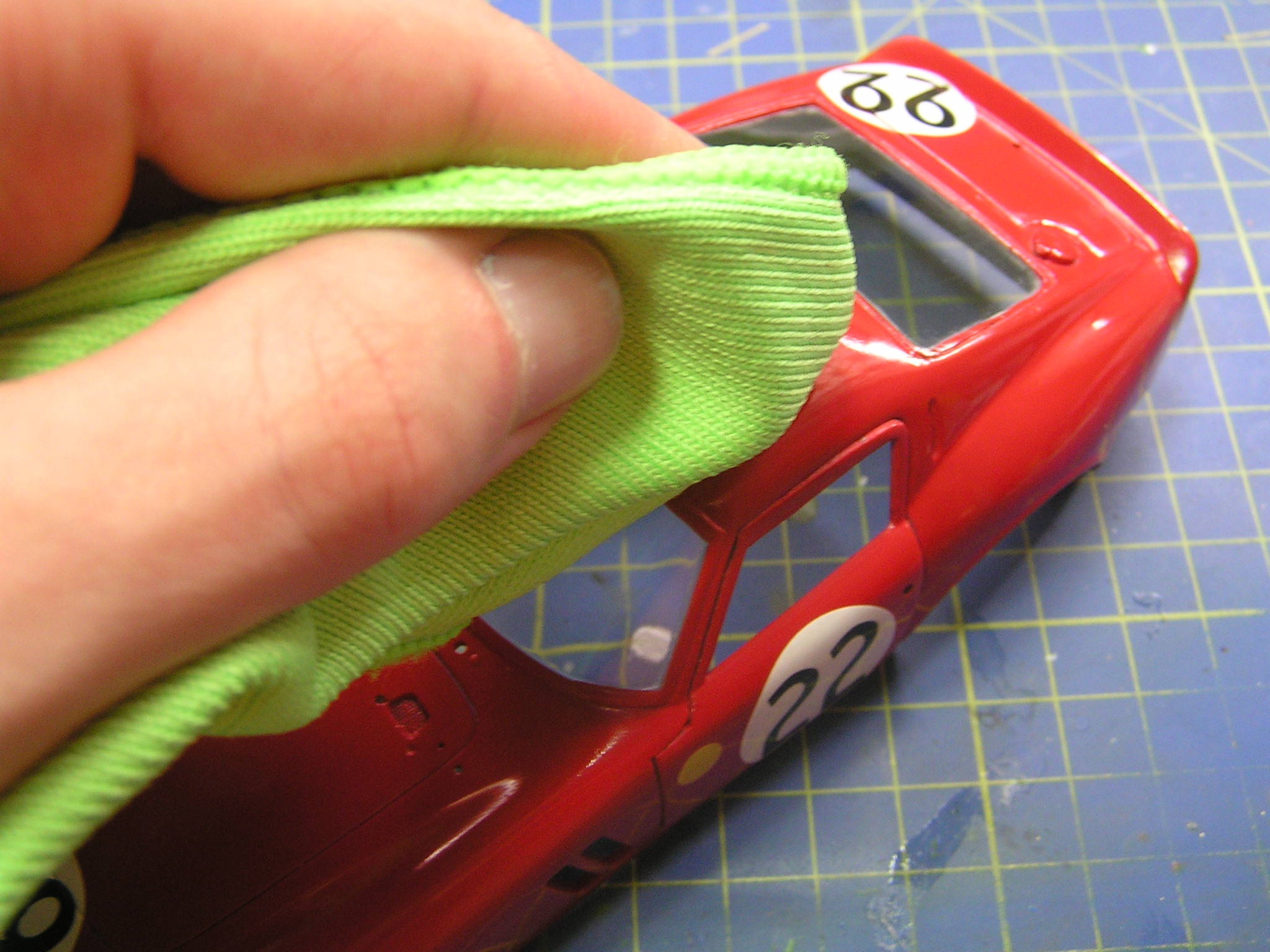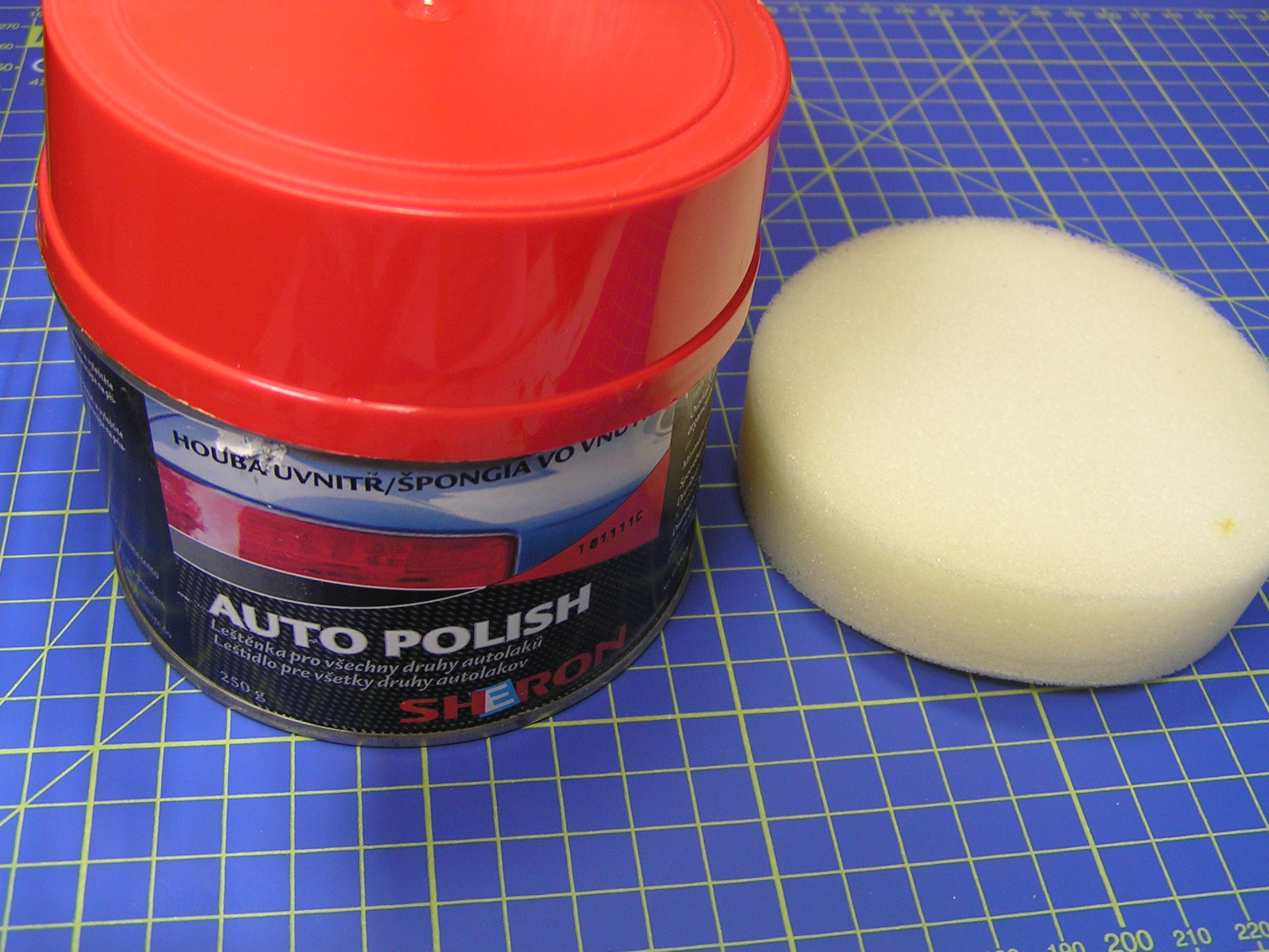 Lak vypadá velmi dobře i bez leštění, ale pokud to ještě pořád nestačí, tak lze výsledný vzhled ještě trochu vylepšit dodatečným vyleštěním. Já jsem použil leštěnku na skutečná auta. V Tescu jsem sehnal leštěnku od Sheronu a stála okolo 150 korun. Uvnitř balení je jemná houbička se kterou jsem nanesl obsah na model a nechal na hodinu zaschnout. Leštění jsem prováděl mikrotenovou utěrkou krouživými pohyby. Připadá mi, že leštěnka povrch více sjednotila a lépe se utírají otisky prstů než před její aplikací. Překvapilo mě, že jsem zahladil leštěnkou i drobné škrábance na čirých dílech.