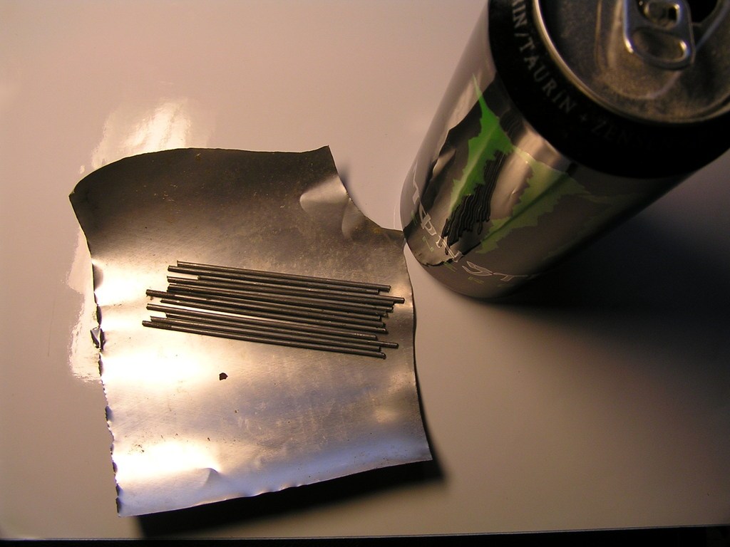 Základem je hliníkový tenký plech, který můžeme lehce sehnat z plechovek od energetických nápojů, kterým odřežeme dno a hrdlo. Také doporučuji barvu z pláště plechovky obrousit smirkovým papírem, jelikož barva může začít hořet. Patřičný rozměr plíšku ohřejeme nad plamenem a zchladíme ve vodě. Díky tomu hliník změkne a lépe se s ním pracuje. Po ochlazení můžeme začít tvarovat.