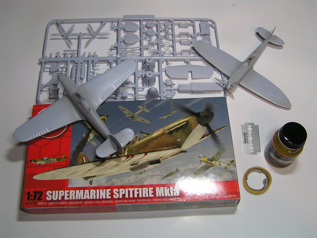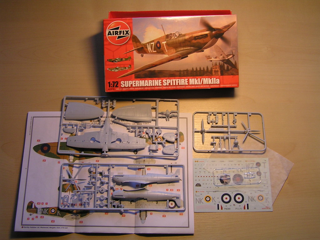 Já jsem si pro tento návod vybral stavebnici Supermarine Spitfire MkI v měřítku 1/72 od firmy Airfix. Model se dá sehnat za cenu kolem 120 korun. V krabičce nalezneme 40 dílu, podrobný návod s barevným kamuflážním schématem a aršík nálepek. Návod si dobře přečtěte a také uschovejte. Jednou z důležitých věcí je, že se dozvíte, jaké barvy budete potřebovat.